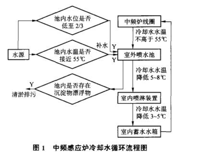 該冷卻系統(tǒng)以潛水泵為動(dòng)力,噴水池和噴淋架為兩級(jí)冷卻裝置,以達(dá)到中頻爐冷卻水循環(huán)使用的目的。當(dāng)水溫超過中頻爐冷卻要求<(55℃)及水量蒸發(fā)損失較多時(shí),則由補(bǔ)水管路及時(shí)補(bǔ)充,同時(shí)及時(shí)排污,保持清潔?!鋮s水池還可為噴水池周邊綠地灌溉,使水資源得到綜合利用。