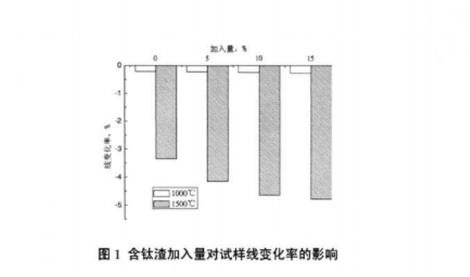 圖1所示為含鈦渣的/JnA.量對試樣熱處理后線變化率的影響。由圖l可以看出,隨著含鈦渣加入量的 增加,經1000*Cx3 h熱處理后的試樣的線變化率相差不大,都存在0.2%左右的收縮。但經1500"Cx3 h 熱處理后的試樣的線變化率則相差較大,隨著含鈦渣加入量的增加而收縮增大,主要是因為含鈦渣的加 入促進了材料的燒結,加入量愈大收縮愈大。但含鈦渣的加入量由10%增加到15%后,試樣的線變化率 變化趨緩,可能由于鈦酸鋁的大量形成,其膨脹抵消了部分的燒結收縮。
