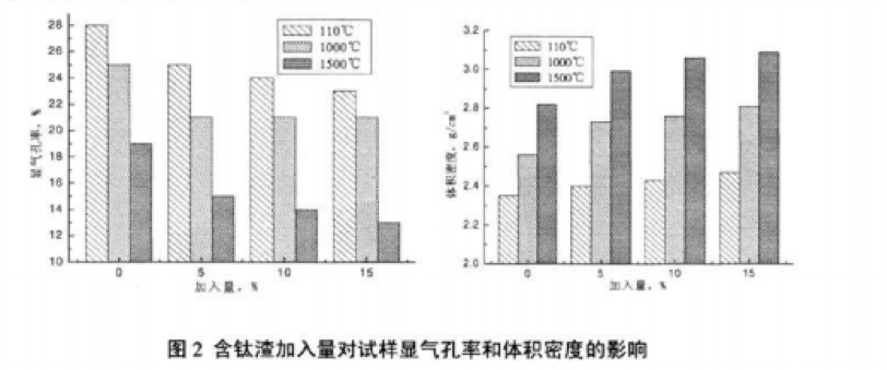 圖2所示為音鈦渣加入量對試樣顯氣孔牢、體積密度的影響。由圖可以看出.在熱處理后,試樣的 顯氣孔率和體積密度隨者含鈦渣的增加而呈現(xiàn)明顯的變化規(guī)律。試樣的顯氣孔率隨含鈦渣的增加而下 降,體積密度隨著含鈦渣的增加而上升。添加了古鈦渣的試樣相比空白樣而占,其顯氣孔牢有明顯的下 降,體積密度顯著增加.尤其是在1500℃的高溫處理后.舍釷渣試樣和空白樣的顯氣孔率和體積密度差 異明顯,這與上部分對試樣的線盤化率的影響分析相對應。隨著熱處理溫度的升高,試樣的顯氣孔率減 小,體積密度相應增大,明顯是含鈦渣的促燒原因。