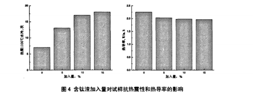 圖4所示為含鈦渣添加量對試樣抗熱震性和1000℃時熱導率的影響。由圖可以看出,含鈦渣的加入 明顯提高了試樣的抗熱震性,降低了試樣的熱導率,且隨著含鈦渣加入量的增加熱震次數(shù)呈上升趨勢、 熱導率呈下降趨勢。但隨著含鈦渣加入量增加,試樣的抗熱震性和熱導率改善趨緩,這可能是由于試樣 中雖有大量鈦酸鋁形成且量逐步增大,但試樣由于燒結好而致密化導致了未現(xiàn)明顯改善趨勢。