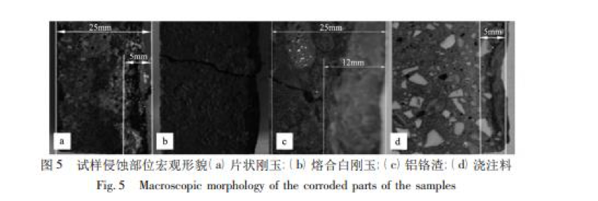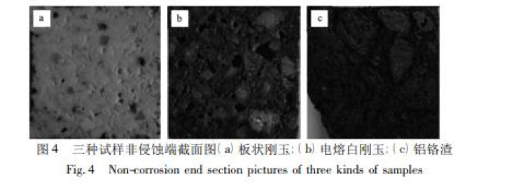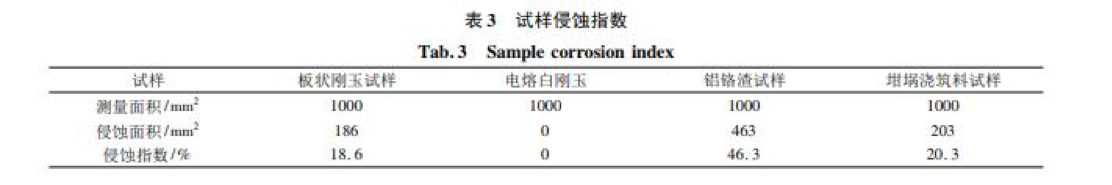 對上述四種中頻爐內(nèi)襯試樣侵蝕部位進(jìn)行觀察如圖 5 所示。試樣寬度均為 25 mm,板狀剛玉試樣被侵蝕約 5 mm, 電熔白剛玉試樣未觀察到宏觀侵蝕,鋁鉻渣試樣被侵蝕約 12 mm,坩堝澆注料試樣被侵蝕約 5 mm,按公式 ( 1) 計算試樣侵蝕指數(shù)如表 3 所示。 侵蝕指數(shù) R = 侵蝕面積 測量面積 × 100%