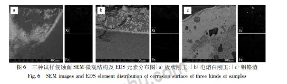 從圖 6b 中可以看出,試樣抗熔渣侵蝕和滲透能力均較強(qiáng)。當(dāng)中頻爐熔渣與試樣接觸時,在工作層表面形成了 一個明顯的邊界層,這是由于基質(zhì)中含有一定量的 Cr2O3,一方面 Cr2O3 與剛玉骨料形成固溶體,鋁鉻固溶體 的存在可阻止熔渣向內(nèi)部的侵蝕滲透,顯著提高其抗 SiO2-FeO 渣侵蝕性能。另一方面渣中的 FeO 和 SiO2 與 Al2O3 和 Cr2O3 成分反應(yīng)生成鐵鉻、鐵鋁尖晶石、莫來石等高熔點(diǎn)化合物,生成的高熔點(diǎn)化合物填充于基 質(zhì)和氣孔從而提高了材料的致密性度并且能有效的抵抗?fàn)t渣的侵蝕。圖 6c 為鋁鉻渣經(jīng)爐渣侵蝕后的 SEM 和 EDS 圖片,由于試樣氣孔率較高,且骨料雜質(zhì)含量高,導(dǎo)致高溫?zé)蓵r液相量和基質(zhì)遷移所造成的空隙增加。 高溫下,中頻爐熔融的爐渣和液相沿著氣孔、裂紋和空隙滲入材料內(nèi)部導(dǎo)致爐渣對試樣的侵蝕深度的急劇增加。