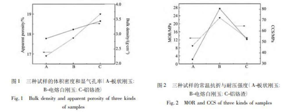 中頻爐內(nèi)襯材料板狀剛玉、電熔白剛玉、鋁鉻渣三種試樣的體積密度、顯氣孔率、常溫抗折強(qiáng)度和常溫耐壓強(qiáng)度如圖 1、 圖 2 所示。由圖可知,板狀剛玉試樣顯氣孔率最小,鋁鉻渣顯氣孔率最大,但是板狀剛玉的體積密度小于鋁鉻渣的體積密度。電熔白剛玉的顯氣孔率和體積密度雖處于板狀剛玉和鋁鉻渣兩者之間,但電熔白剛玉試樣常溫抗折和耐壓強(qiáng)度最大。因此就中頻爐內(nèi)襯材料綜合性能而言,電熔白剛玉試樣最佳。
