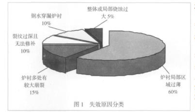 柳工機械股份有限公司鑄鋼廠每年熔煉鑄鋼鋼 液約 16000t,使用 6t 中頻爐和 3t 電弧爐熔煉碳鋼。長期以來中頻爐使用一家知名的爐襯材 料供應商提供的爐襯材料,但一直存在著中頻電爐爐襯壽命 偏短的問題,平均爐襯壽命約 45 爐。爐襯壽命偏短 導致頻繁的修筑爐襯和烘爐,對生產組織和成本控 制都帶來了很不利的影響。為了解決這個問題,從 2008 年 6 月開始,我們開始在延長爐襯壽命方面進 行探索。我們首先進行了中頻爐煉鋼爐襯的失效原 因分析。 根據(jù)對 2008 年全年筑爐 25 次的失效統(tǒng)計,目 前的中頻電爐爐襯材料最主要缺點是裂紋傾向大,爐襯容易 因裂紋而導致多處崩裂、造成局部區(qū)域過薄而失效; 其次是中頻電爐爐襯下部燒蝕過快導致爐襯失效。失效原因 分類見圖 1。