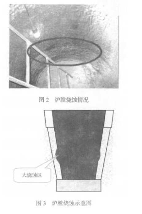 2009 年 2 月,我們與一家知名的爐襯材料供應 商共同按照我們提出的性能要求選擇了一種爐襯材 料并進行首次工藝試驗。首次試驗爐襯壽命為 40 爐次,未達到 預期要求。分析原因為爐膛中下部局部燒蝕 過大造成失效,如圖 2、圖 3 所示。 從試驗后拆爐過程看,爐襯整體未發(fā)現(xiàn) 有大的裂紋和崩裂。這說明這種爐襯材料產 生裂紋的傾向性很小,安全性較好。爐襯的 上部和爐底損壞較??;但是在爐身中下部, 爐身 1/3 高度上有明顯的較大燒蝕區(qū).